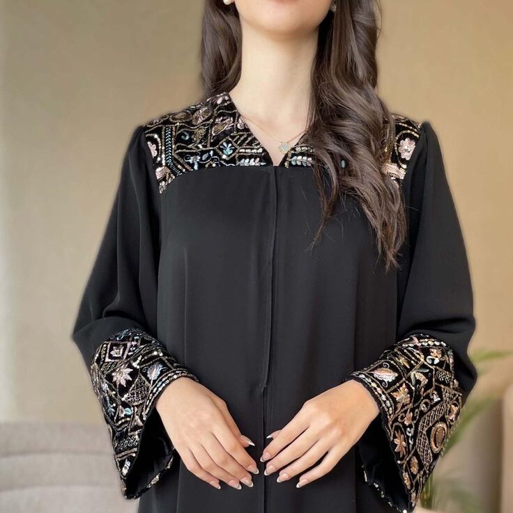 Featuring intricate embroidery along the front panel, this abaya blends tradition with modern style. Perfect for festive events and gatherings.